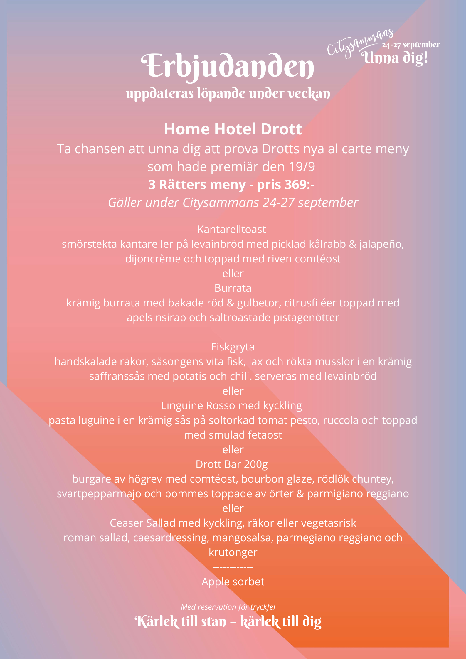 Sista chansen för Citysammans 3 rätters på Olsons Bazar och Home hotel Drott, läs menyerna nedan